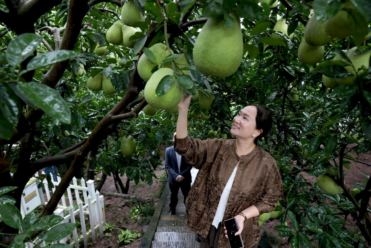 10月20日,在四川省广安市广安区龙安乡群策村的龙安柚现代农业园区,游客在硕果累累的柚园打卡。