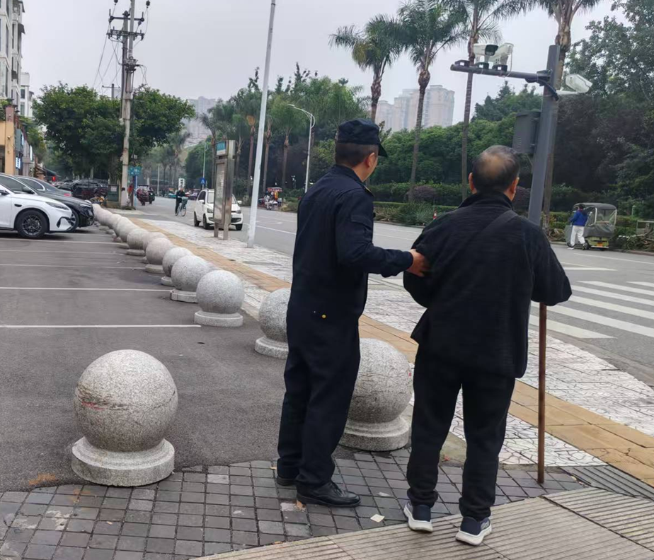 一路同行,队员的提醒始终温和:“小心,这里有点不平”、“前面有缓坡”。他一边细致地引导着脚下的每一步,一边与老人轻声交谈,舒缓着老人紧绷的神经。直到将老人护送至其熟悉的住所附近,确认老人能够安全自行返家后,队员才放心地转身,重新汇入巡逻的队伍。