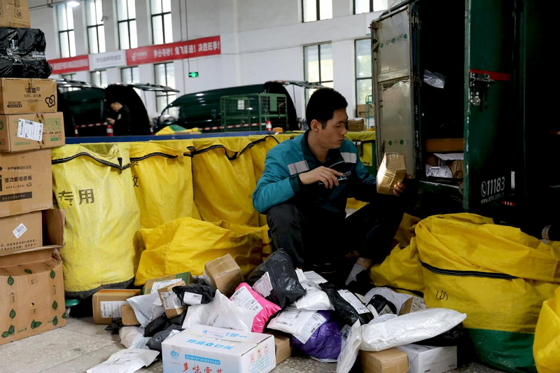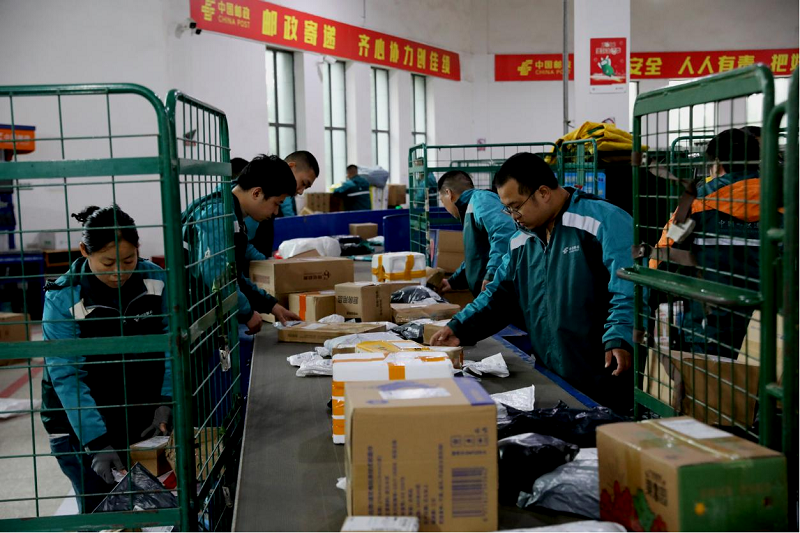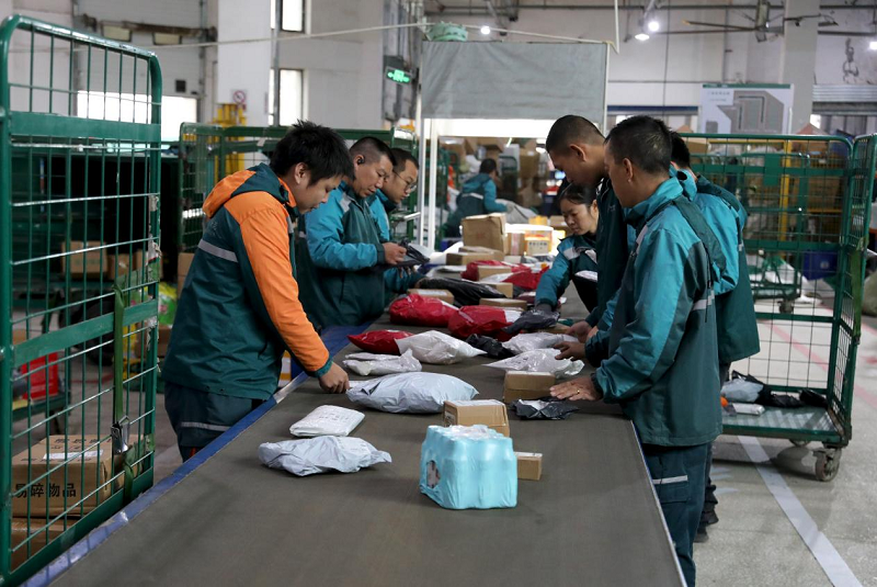 11月11日,中国邮政集团有限公司广安市广安区分公司邮件处理中心城区揽投部,工作人员正在手持PDA扫码下段快递包裹,准备投递。