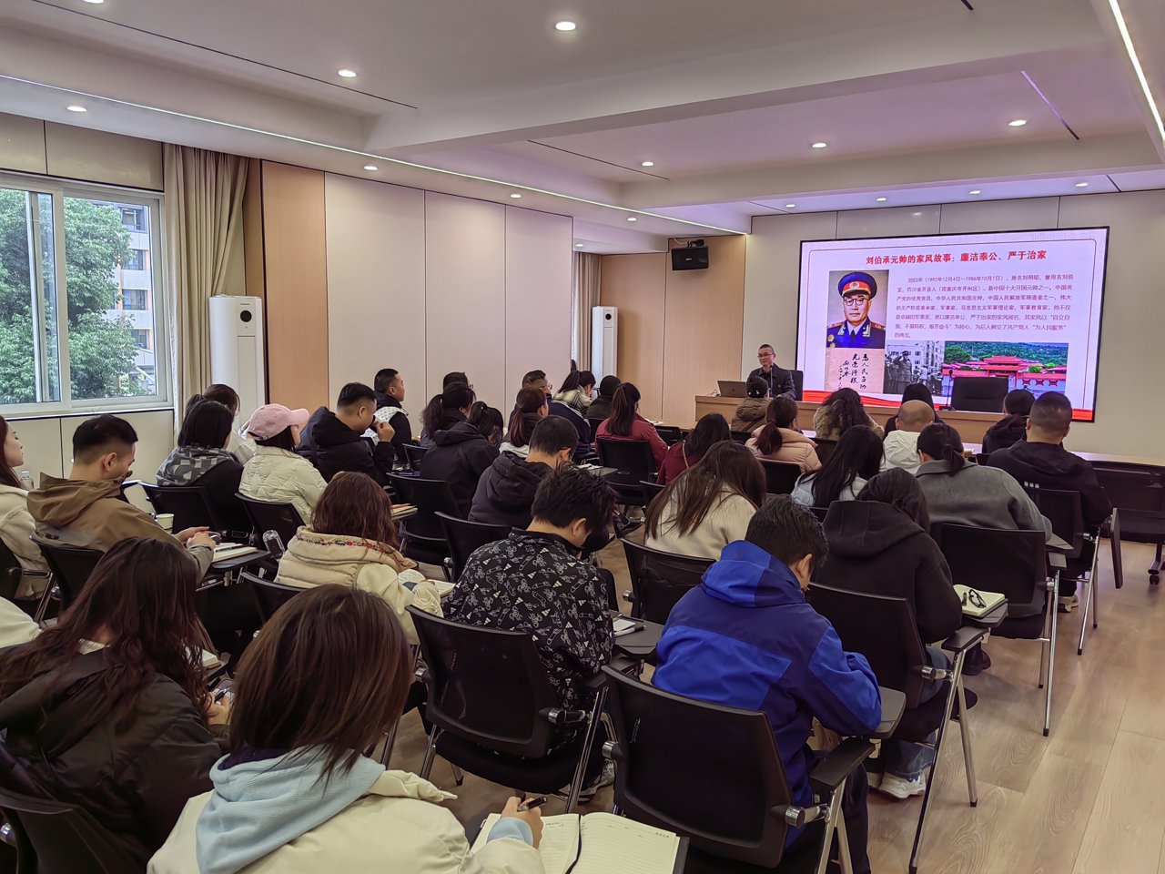 讲座现场,廖良开结合自身经历与经典案例,生动诠释了优良家风的精神内核。他首先讲述了习近平总书记注重家风建设的故事,以及刘伯承元帅“廉洁奉公、严于治家”的家训传承,让听众深刻认识到优良家风对个人成长、家庭和睦与社会和谐的重要意义。“刘伯承元帅要求子女‘自己的路自己走’,不搞特殊化,这种严以修身、严以治家的作风,值得我们每一个家庭学习。”廖良开的讲解引发阵阵掌声。